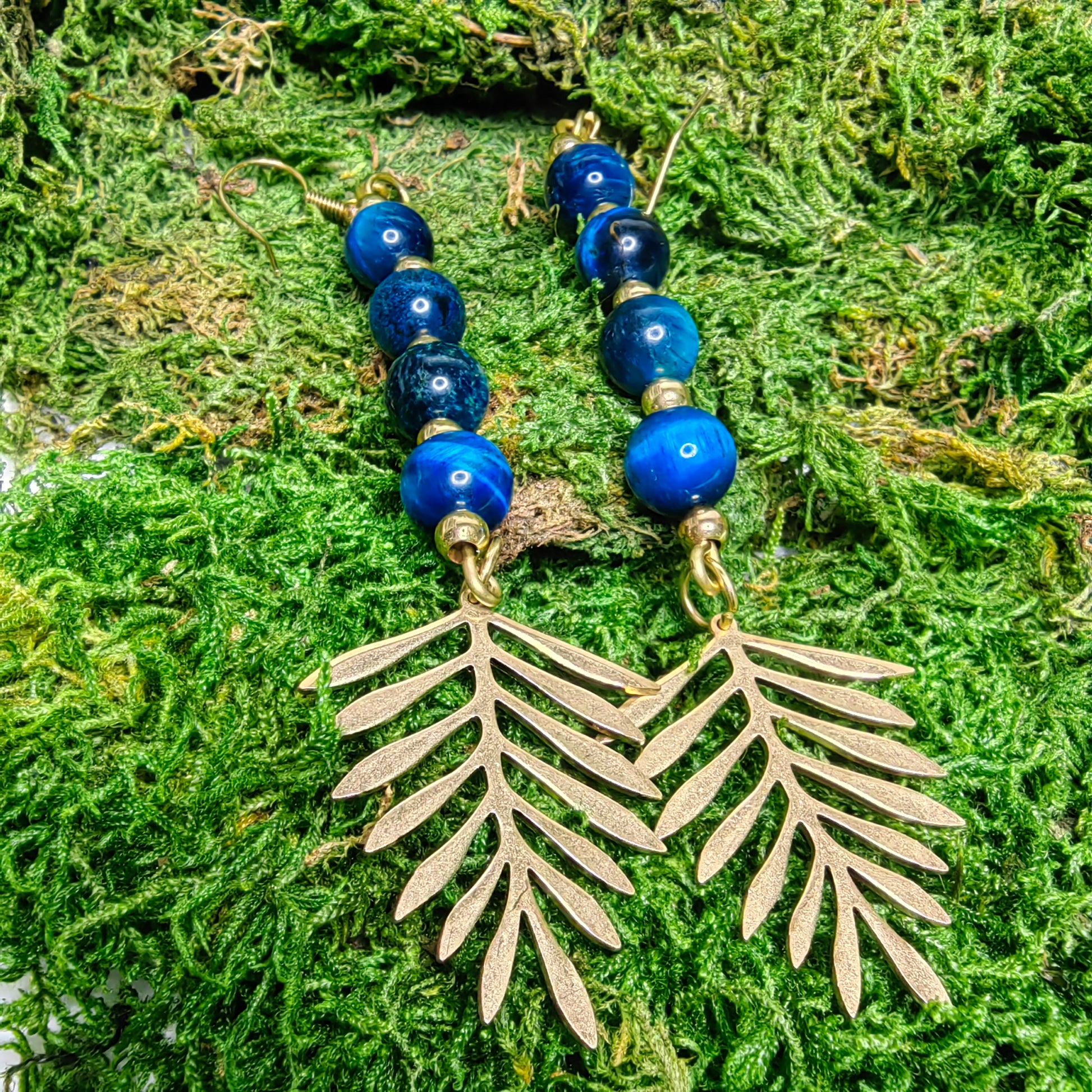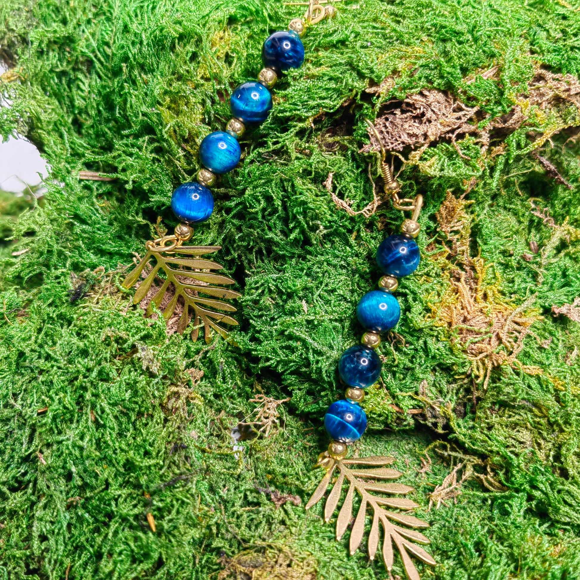 Découvrez nos magnifiques boucles d'oreilles en perles de laiton et perles naturelles de œil de tigre bleu paon.