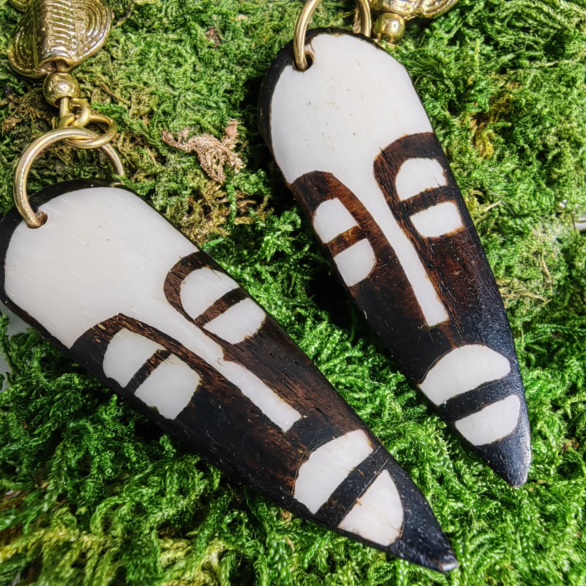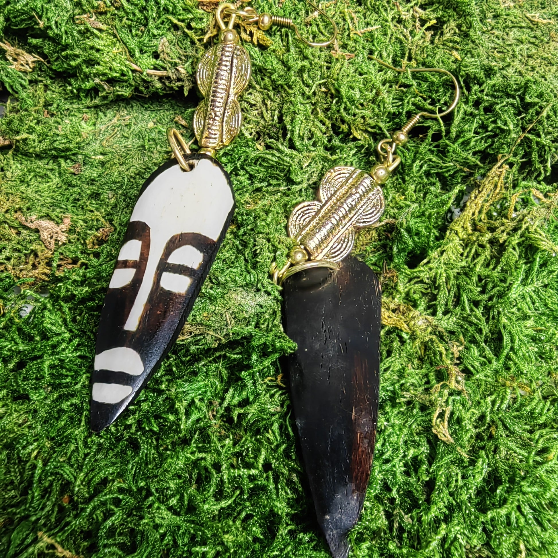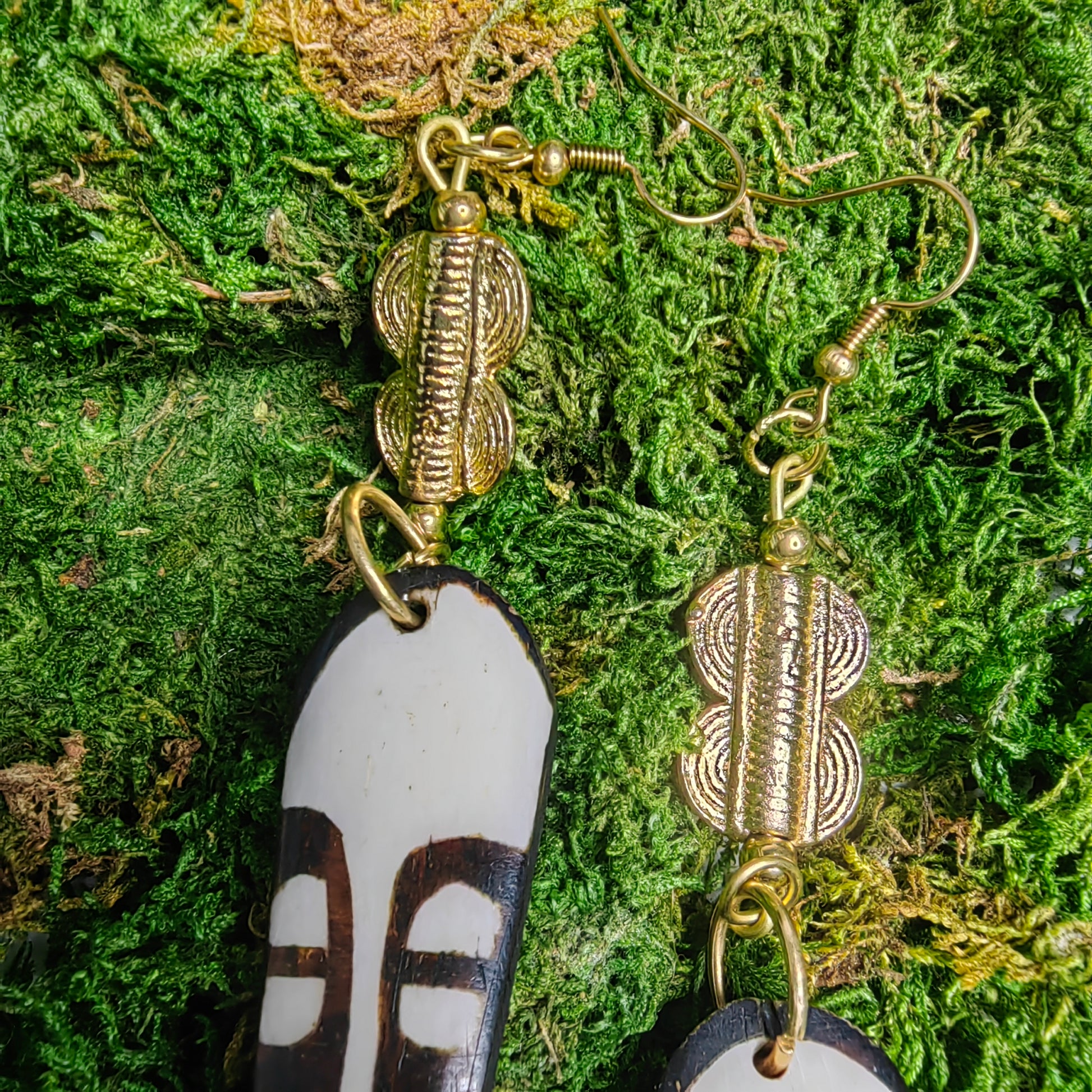 Découvrez nos magnifiques boucles d'oreilles en laiton accessoirisées par des poids Akan et des pendentifs en os de batik venant du Kenya.