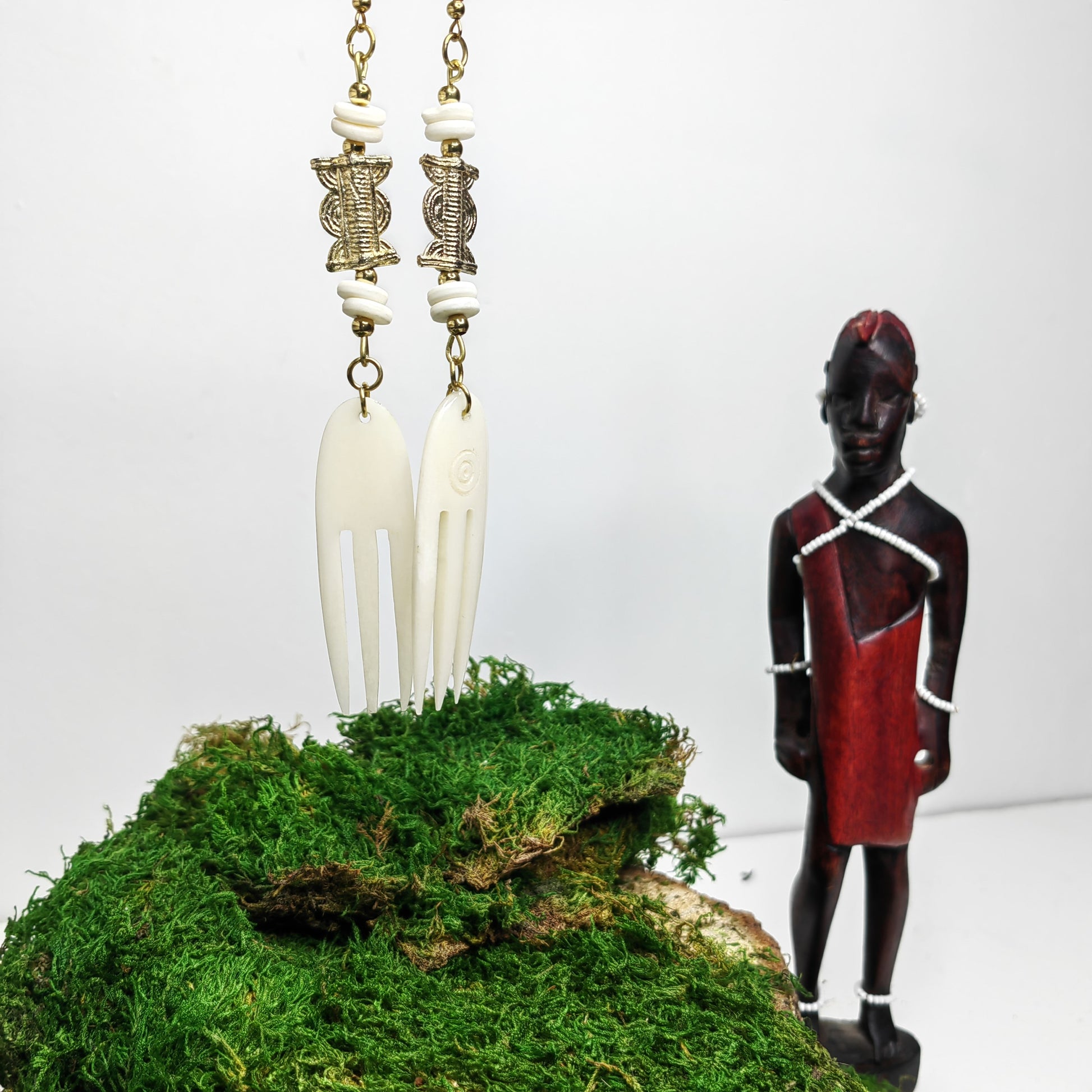Découvrez nos magnifiques boucles d'oreilles en laiton accessoirisées par des poids Akan et des pendentifs en os venant du Kenya.
