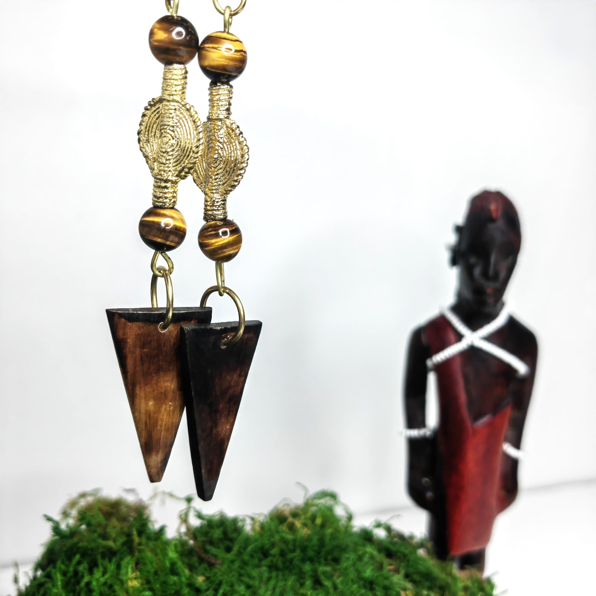 Matière : poids Akan en laiton - perles en pierre naturelle d' Agate œil de tigre or marron - pendentifs en os .