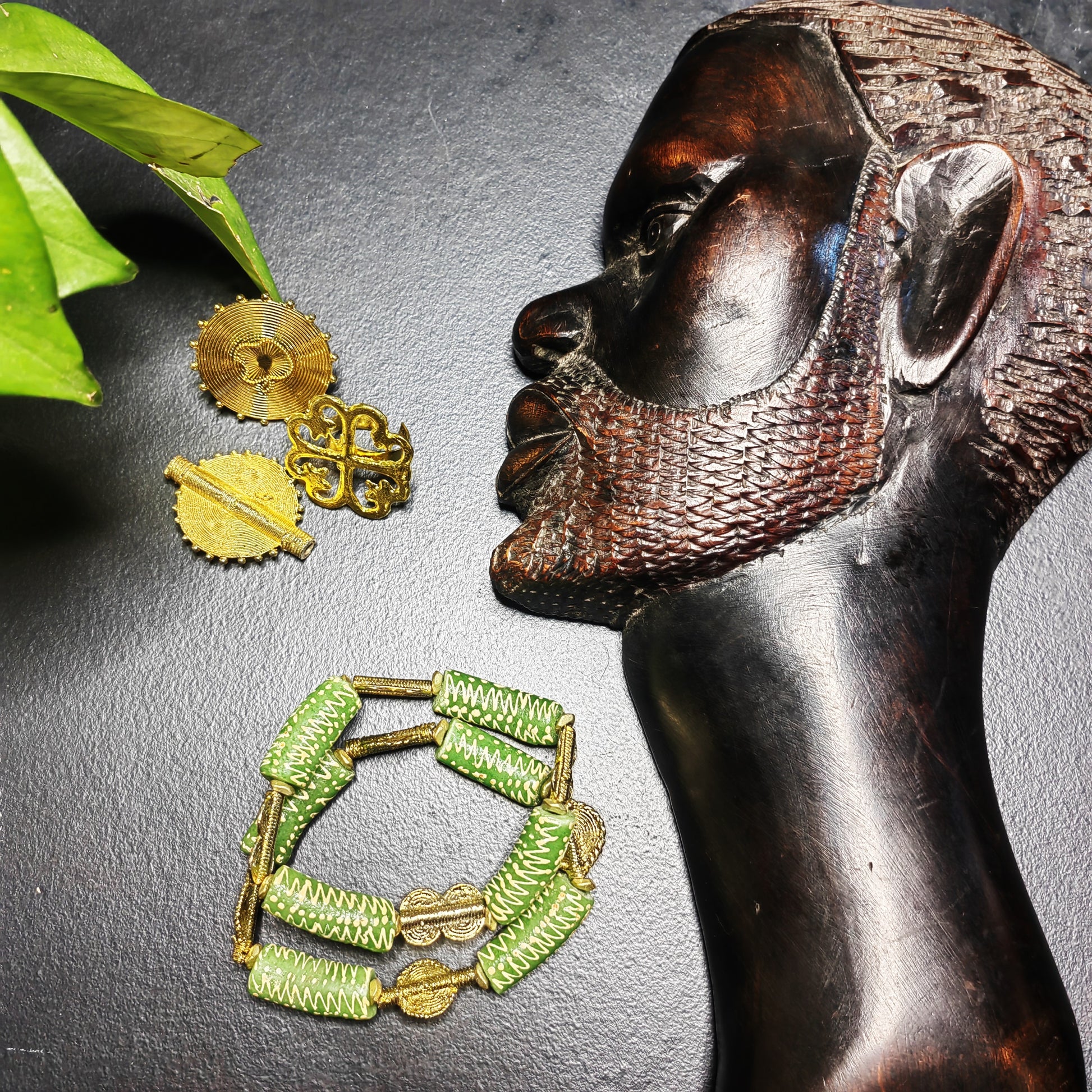 Lot de 2 bracelets en perles krobou (perles de verre recyclée d'origine Ghanéenne ) accessoirisé par des poids akan en laiton.