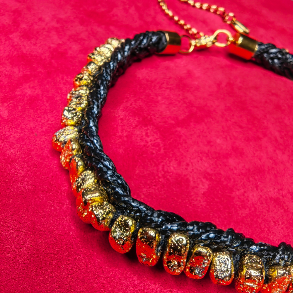 Note de l'artisan : Ce collier est intégralement tressé et cousu à la main. En raison de ce processus artisanal et de l'utilisation de matériaux naturels, chaque exemplaire possède des nuances propres qui soulignent son authenticité. Le travail étant réalisé à l'aiguille, de petits fils peuvent parfois être visibles à l'œil nu, témoignant du passage de la main de l'artisan sur la matière.
