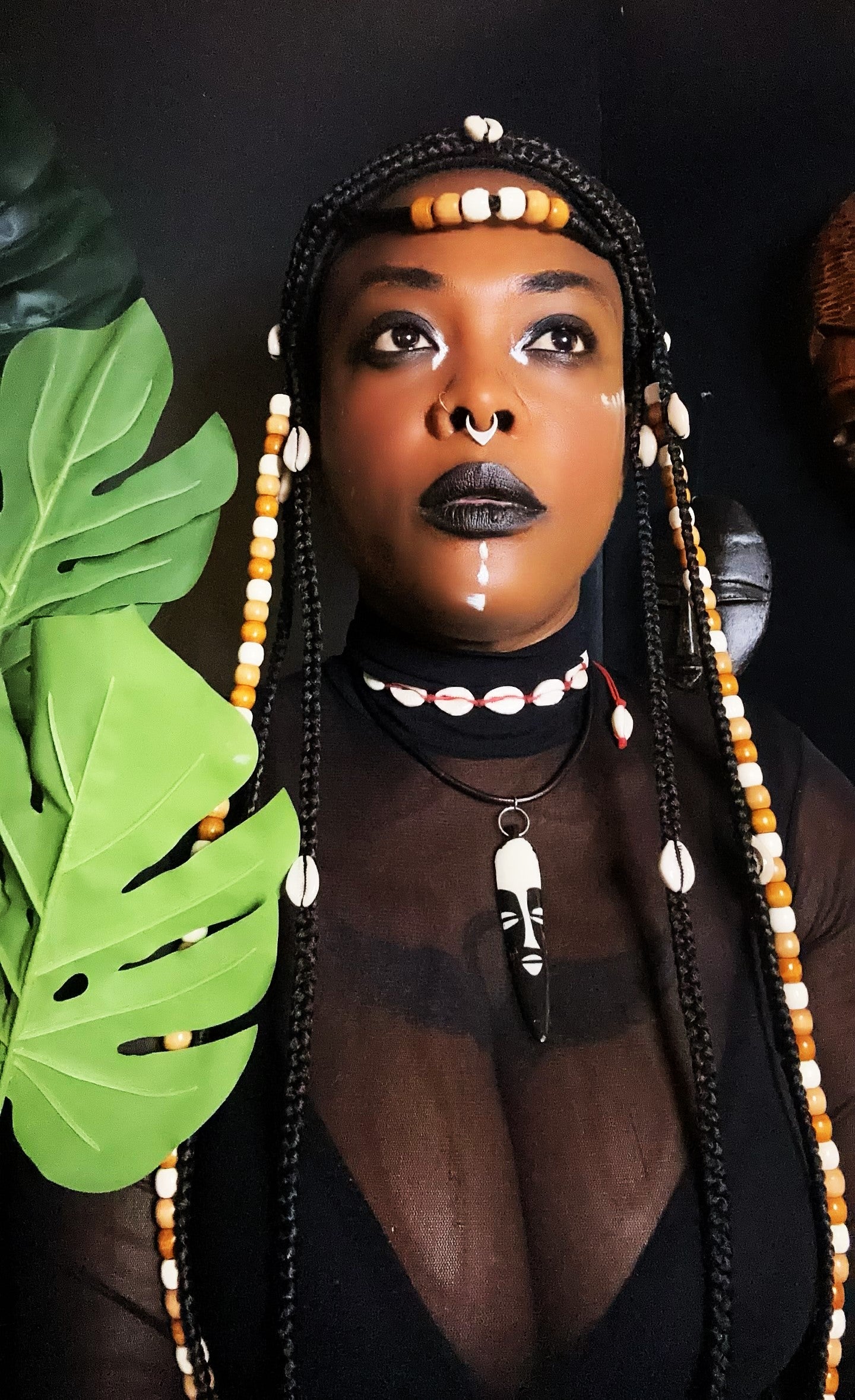 Les tresses délicates évoquent l'élégance naturelle tandis que les cauris cousus sur elles ajoutent une touche de mystère et d'exotisme.